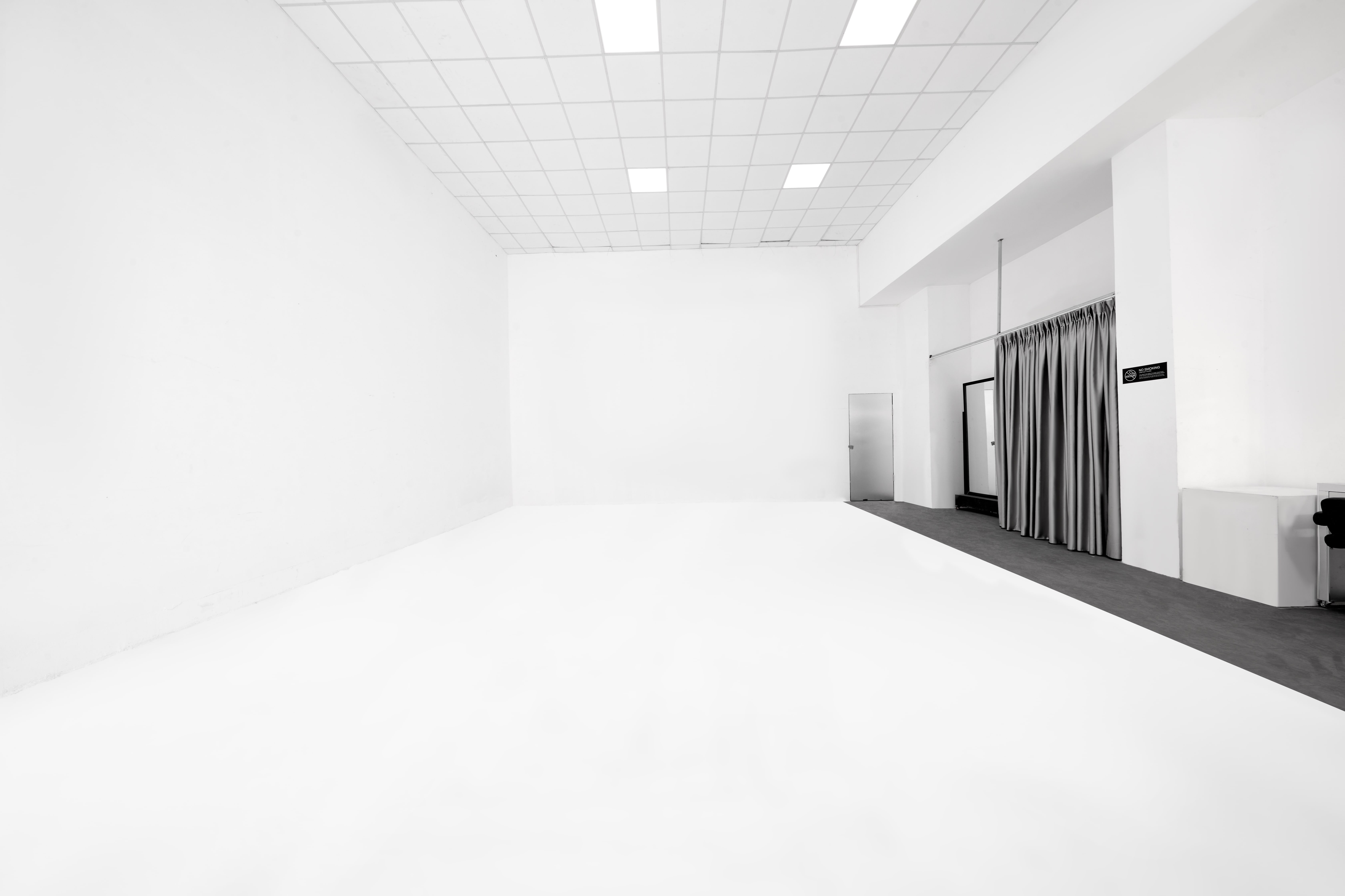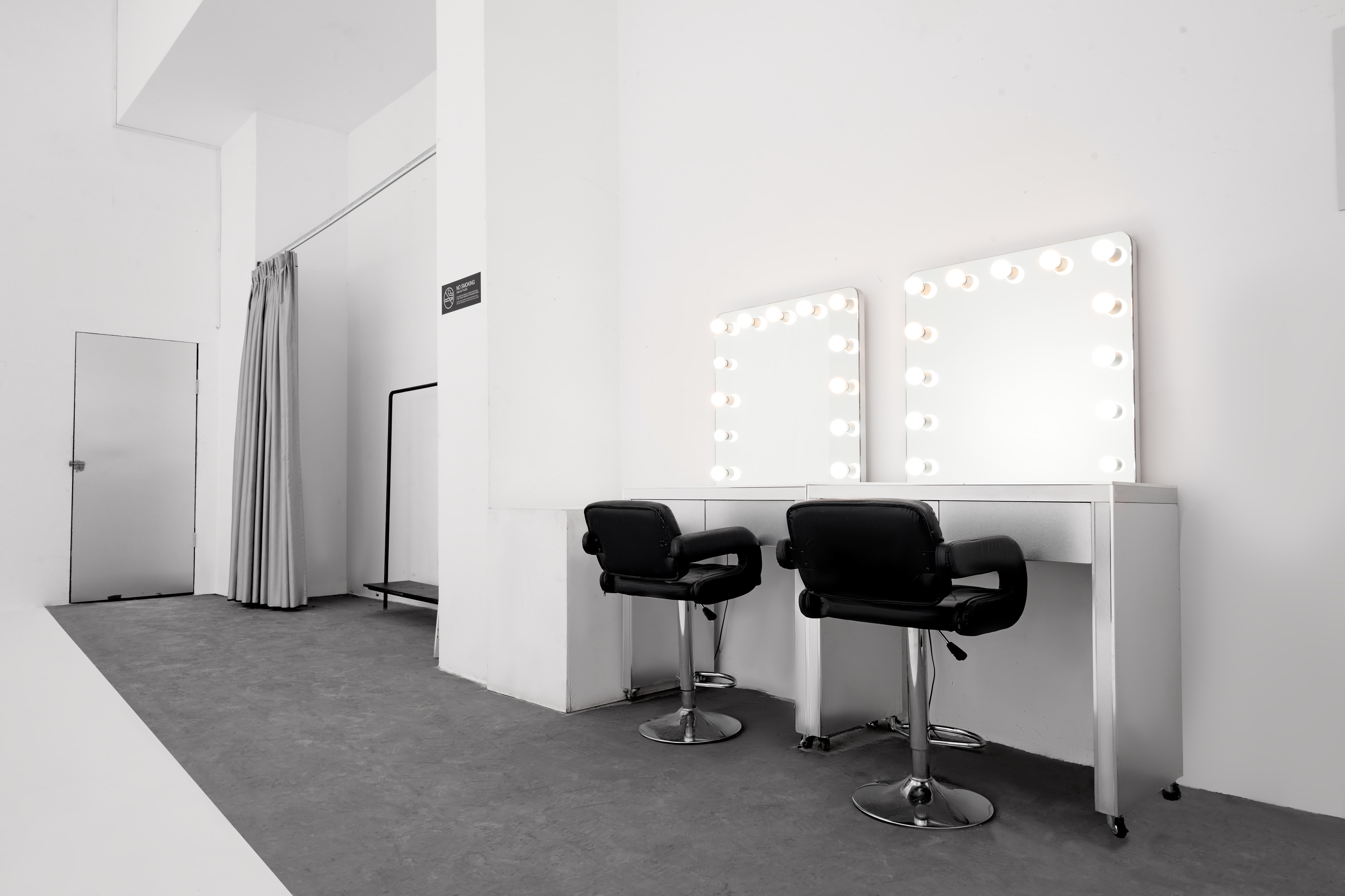 Free use of 3 photography lights. Dedicated makeup and changing room. Private bathroom. Private rest area and office. Scaffolding ceiling