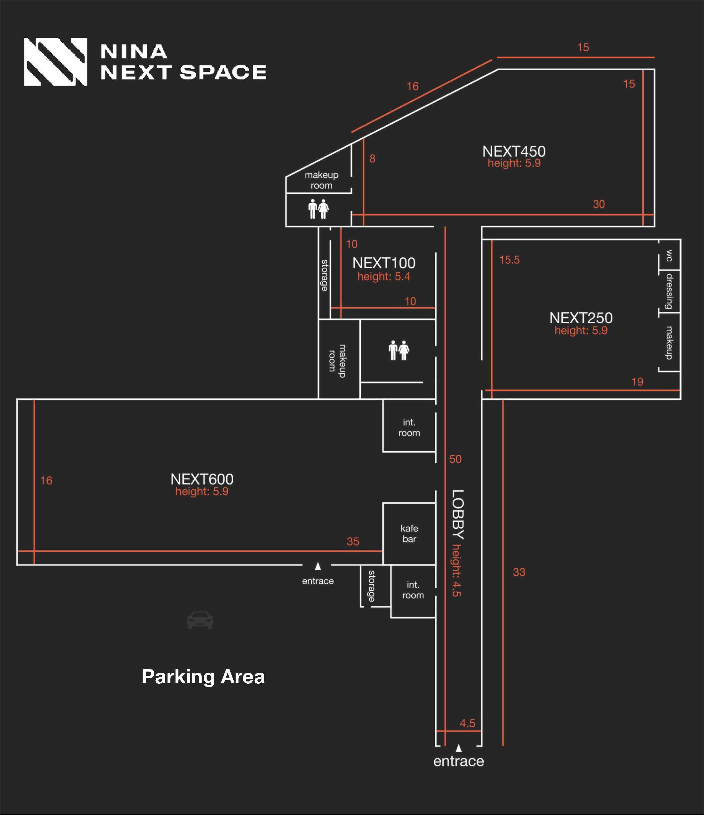 Nina Next Space is a thoughtfully designed creative complex offering a wide range of studio options to meet various production needs — from compact shoots to grand-scale setups. With four distinct studios — NEXT100, NEXT250, NEXT450, and NEXT600 — each space is optimized for flexibility, functionality, and convenience. Whether you're planning a photo shoot, filming, or hosting a creative event, our detailed floor plan ensures a seamless and professional experience.